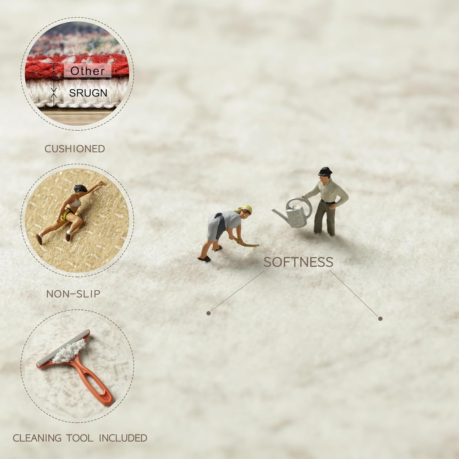 - CLEANING TOOL INCLUDED: Pet hair, crumbs, crayons, and even dust—plenty of debris can end up on a well-loved carpet. This is just one reason we’ve created our family & pet friendly rug with a low pile to prevent build-up. Plus, we even include a free cleaning tool to help you take care of your neutral bedroom rugs with ease