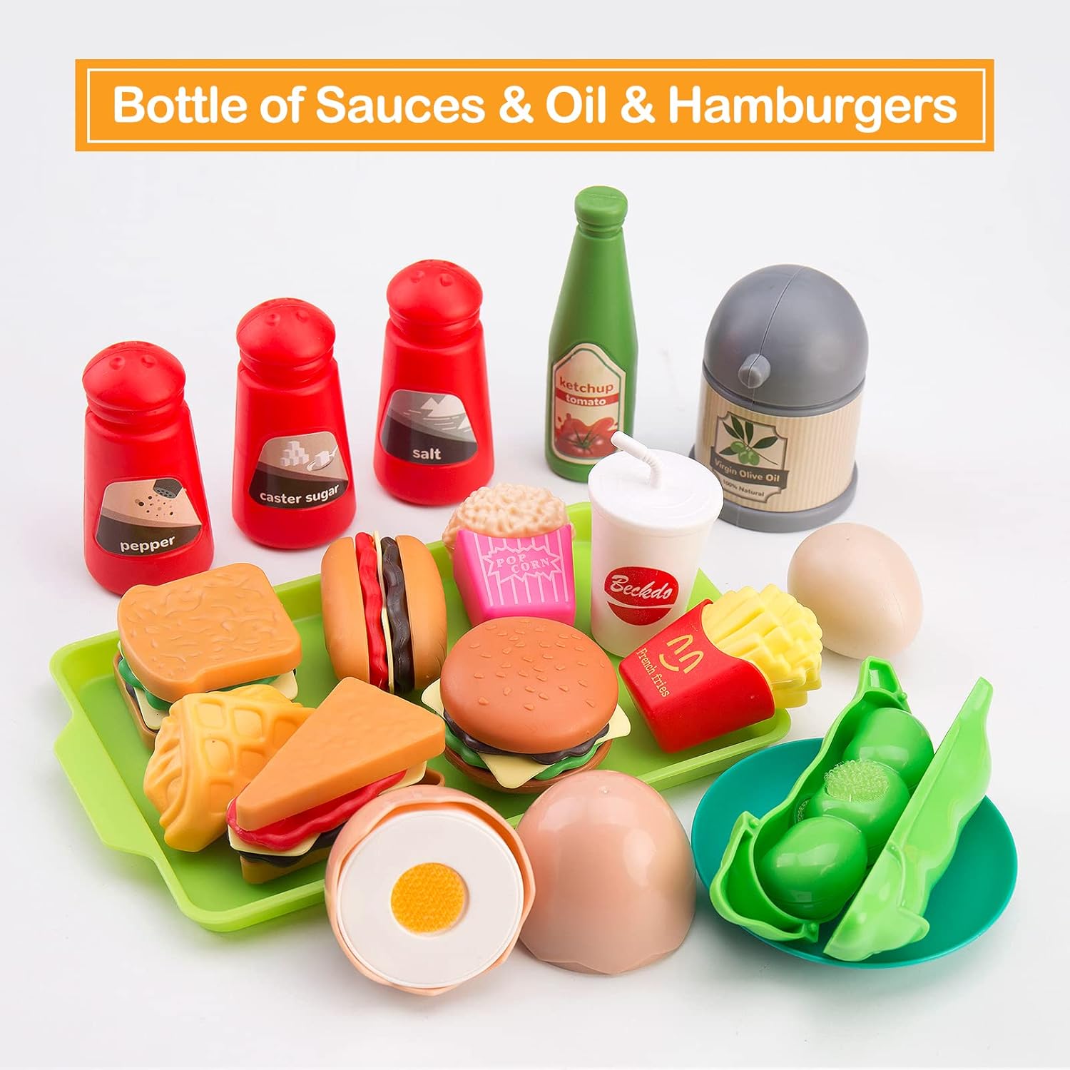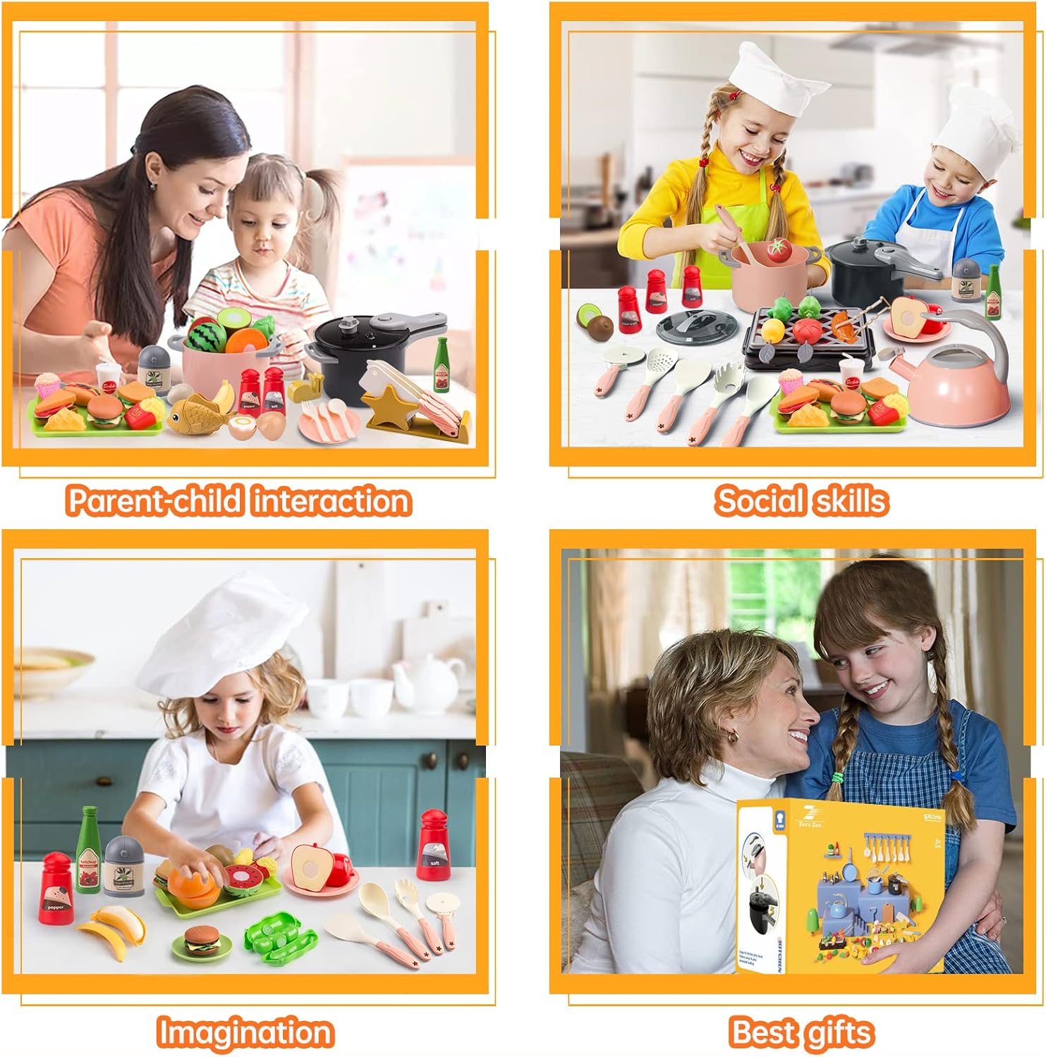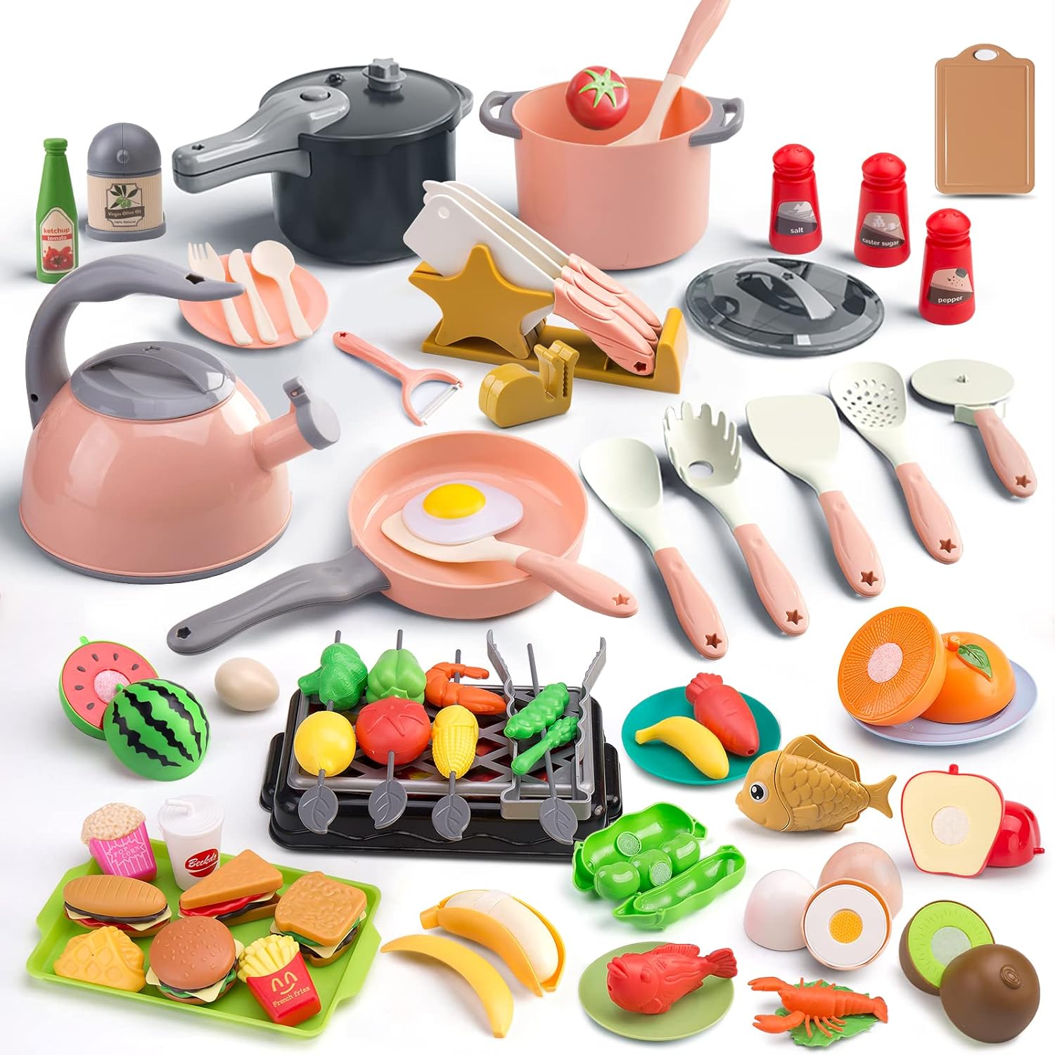 - 【Complete Kitchen Cooking & BBQ Toy Set】Each kitchen set comes with 105Pcs fun, and engaging pretend kitchen toys, include play pots and pans sets, kettle, bowls, plates, chopsticks, toy kitchen cookware, barbecue play set, knives set, canned pretend cuttable food & vegetables, fast food set, and much more to provide endless hours of fun