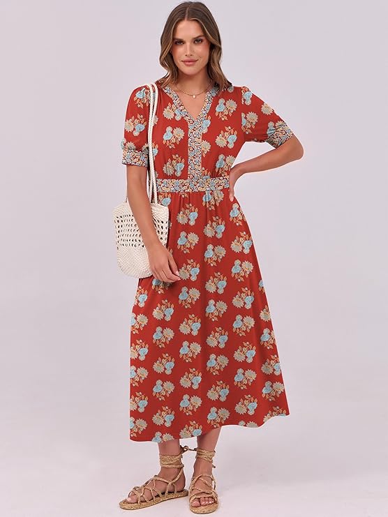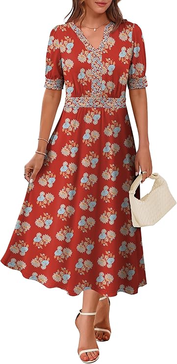 • Features – Women’s summer floral midi dress, v neck, puff sleeve, A-line, beach dress, boho sundress, swing dress