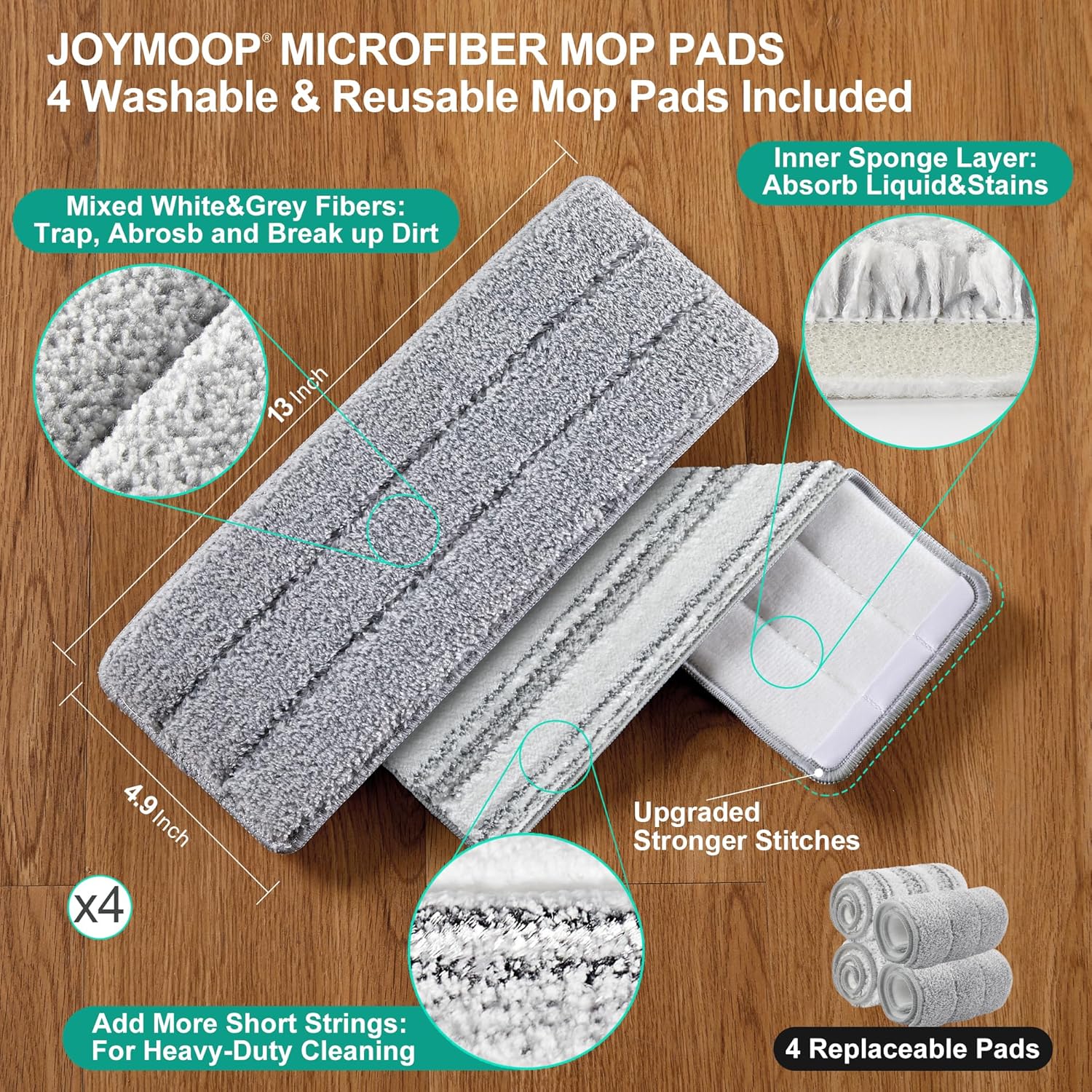 - [Reusable Cleaning Microfiber Cloths] Applied to a 13.0 by 4.9-inch mop head. 4 microfiber mop pad refills come with this set. Strong water absorption lets you easily do any wet and dry cleaning. To keep long-term usability, recommend changing refills every 1-2 months based on usage frequency
