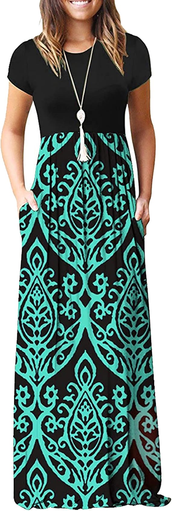 - Features:Short sleeve summer maxi dresses with crew neck, floral print or patterned, plain, two side pockets, floor length, not see through, elastic at waist,allowing you to wear it comfortably without losing sexy and stylish