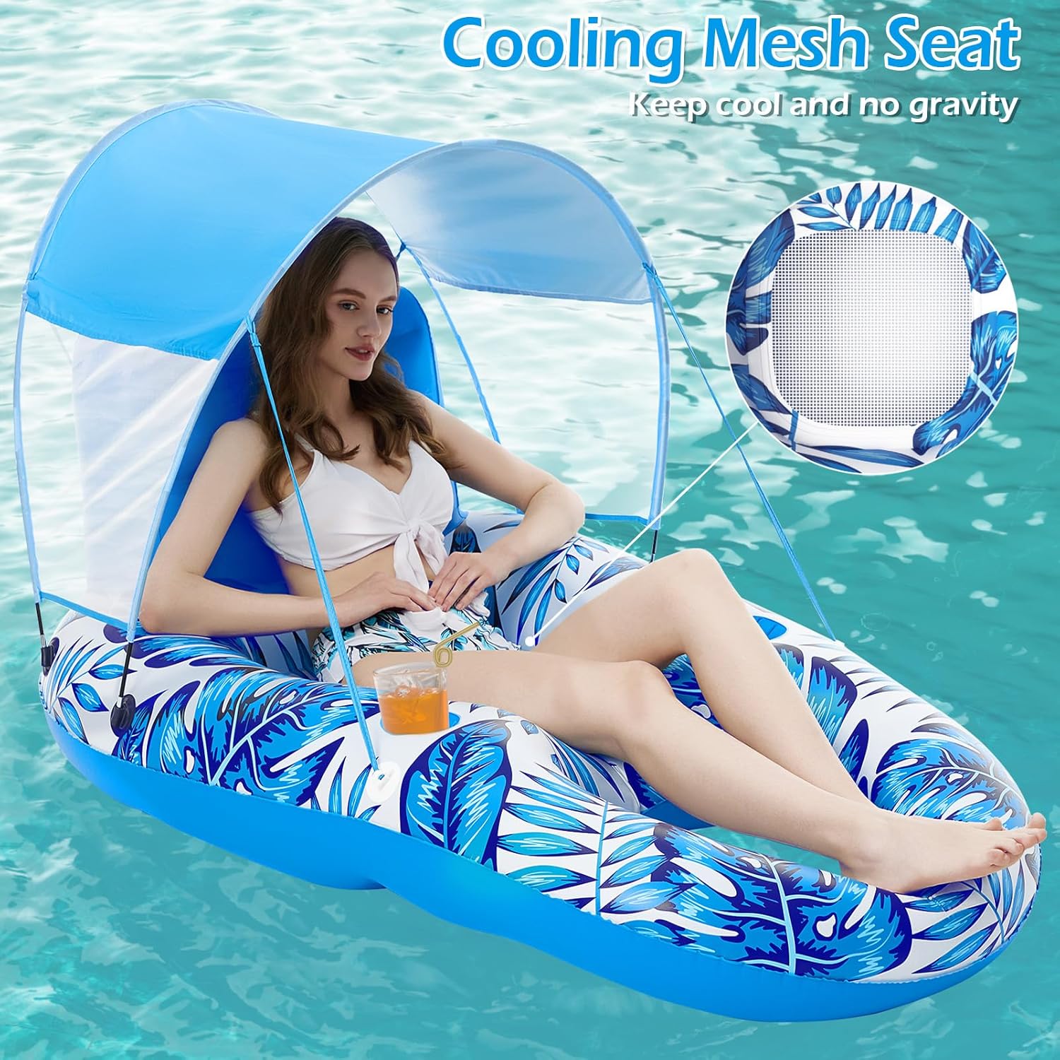 • Inflatable Pool Float with Taller & Removable Sun Canopy – The canopy is taller, offers a better view and ultimate comfort. Well-ventilated and UPF50, has great airflow to stay cool and comfortable. Thicker support poles for enhanced stability. Patent Pending Design.