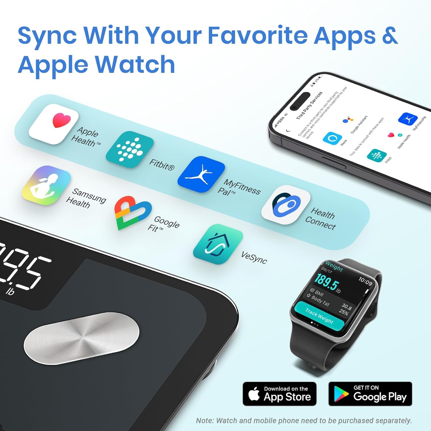 - πΌππ ππππ π¬πππ: Seamlessly integrate our scale into your fitness routine. Compatible with APPLE WATCH and syncs data with popular fitness apps like Apple Health, Samsung Health, Google Fit, FitBit, and MyFitnessPal. Supports unlimited users for convenience