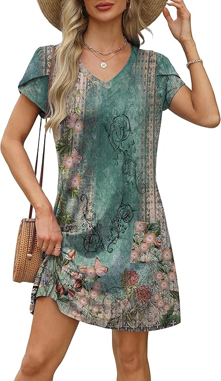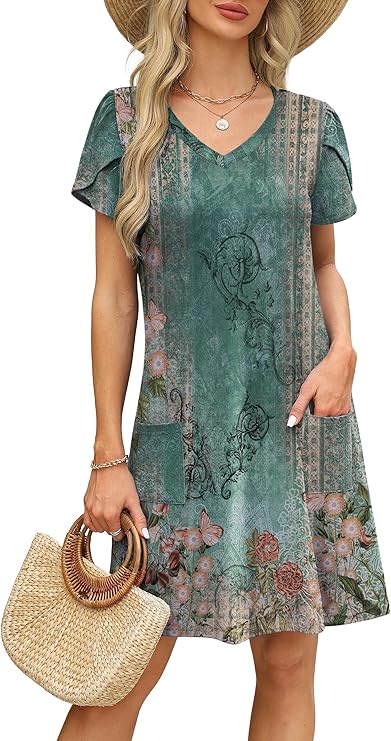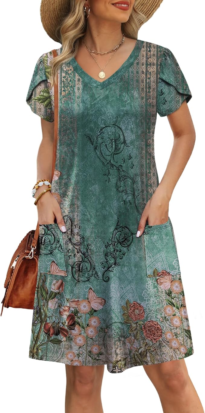 OFEEFAN Womens Summer Dresses 2025 Tulip Petal Short Sleeve V Neck Loose Swing Sundresses with Pockets Plain/Print