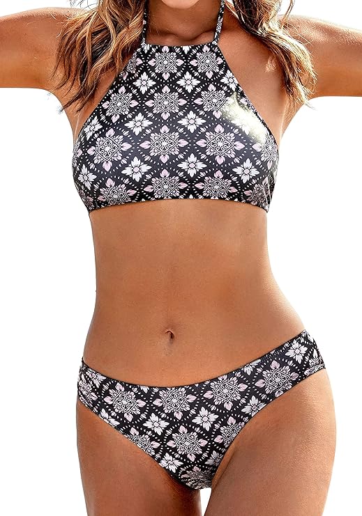 Ekouaer High Neck Halter Bikini Top Floral Swimsuits Two Piece Bathing Suits Triangle Bottoms for Women Teen Juniors XS-XXL