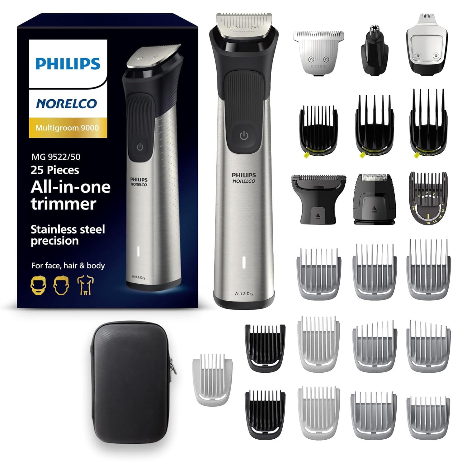- The Philips Norelco Multigroom 9000 provides stainless steel precision with 25 tools and accessories in a premium case; enjoy a perfect beard, hair and body trim with 27 length settings